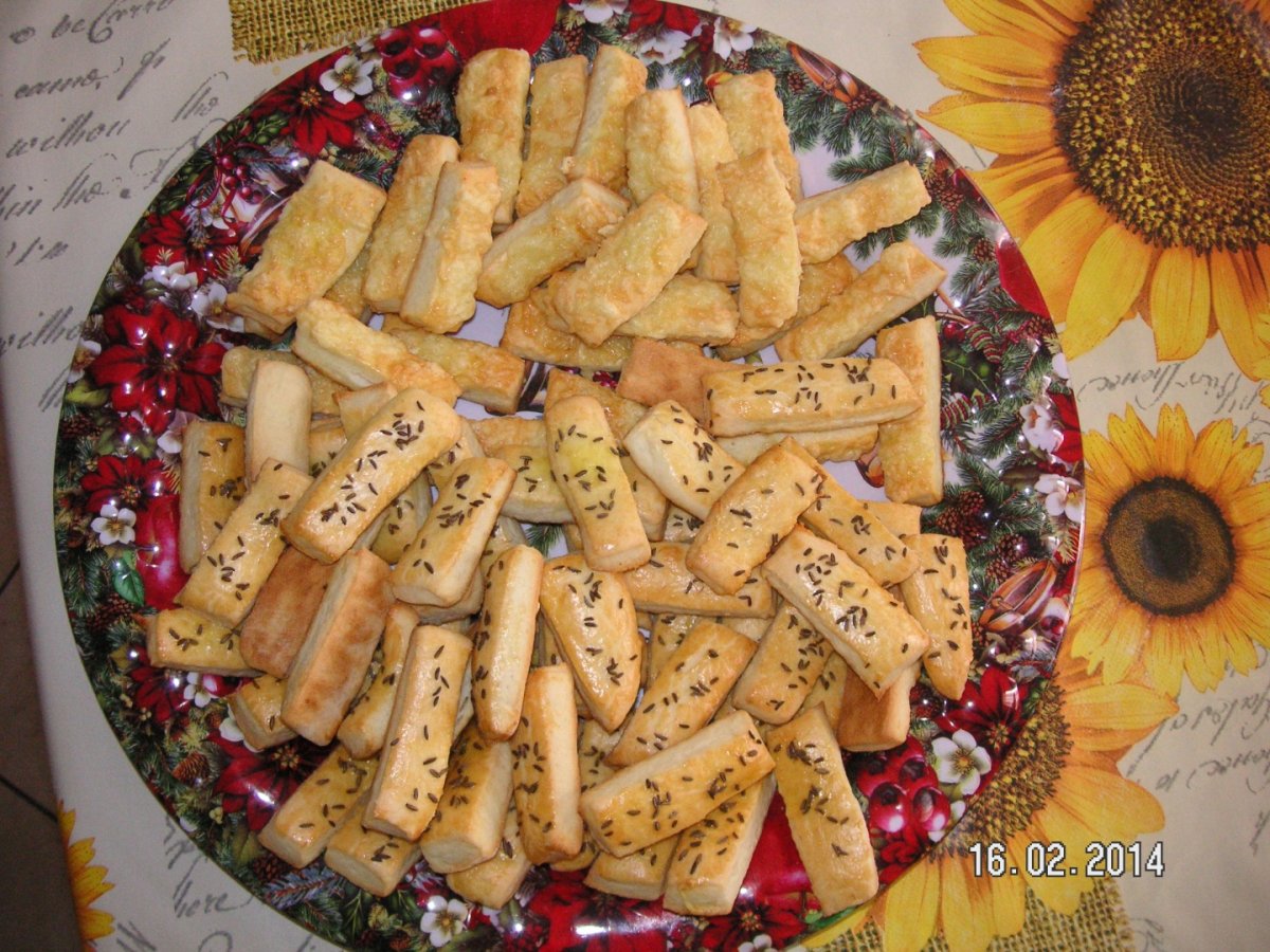 Se amesteca toate ingredientele bine, rezultand un aluat nu foarte tare. Se intinde o foaie nu foarte groasa, deoarece ele vor creste dublandu-se. Se asaza in tava tapetata cu hartie de copt sau unsa cu unt si tapetata cu faina. Se ung saratelele cu ou batut si desupra se pune cascavalul ras sau chimenul. Se baga in cuptorul incins la 180 grade pentru 15-20 minute pana se rumenesc bine.