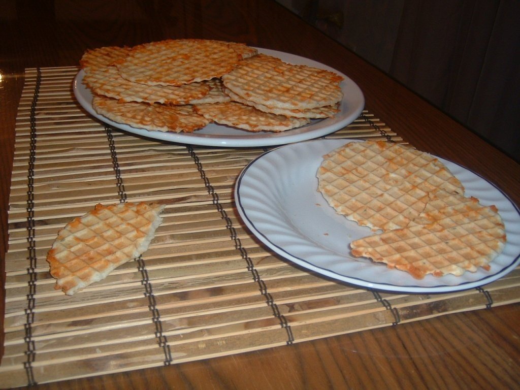 Se da branza pe razatoare.Se amesteca bine toate ingredientele si se adauga apa pana cand obtinem un aluat neted si elastic.Din aluatul obtinut se fac bilute de marimea unei nuci.Se incalzeste presa(a mea este electrica,dar stiu ca in Romania exista presa care se pune pe flacara).Se pune cate o biluta de aluat in centrul formei si se preseaza.Se coc cca. 2 minute(la presa mea fiind electrica le coace pe ambele parti,la cele pe flacara presupun ca trebuie intoarsa presa).
