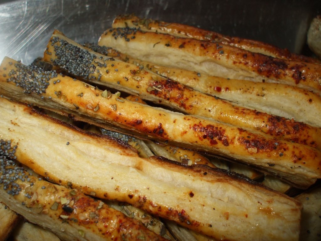 Saleurile nu le-am mai rasucit de data asta, nu avea rost. Le-am pus in tava unsa cu margarina sau unt si am inceput sa presar pe ele mac la un capat, un pic de oregano uscat si ardeiul iute uscat si macinat. In cea de a doua tava, dupa ce am uns saleurile, le-am presarat cu mac si usturoi granulat. Am fost curios sa vad cum iese. A iesit fain.