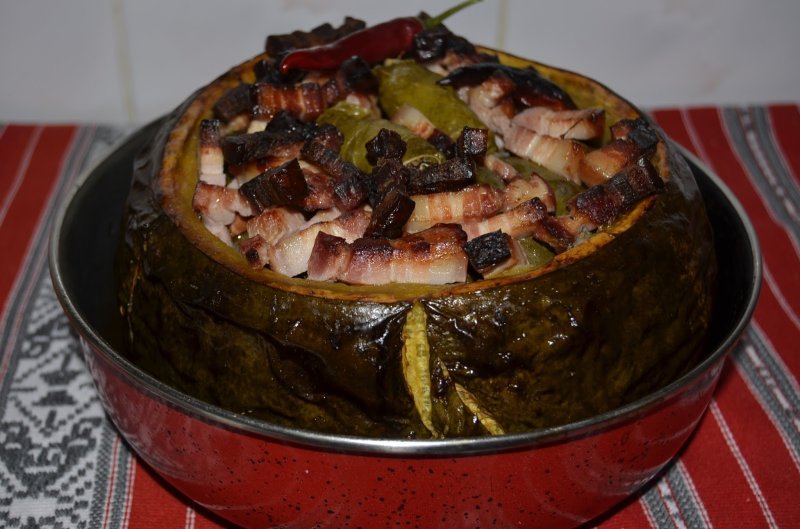 -Luam apoi compozitie cu o lingura, punem pe frunza si rulam usor, dupa rulare indesam marginile frunzelor in interior si gata sarmaluta pe care o asezam in dovleac. Cand se umple dovleacul cu sarmalute tocam bacon si presuram deasupra, mai adaugam cativa ardei iuti, apa cat cuprinde si dam dovleacul la cuptor. Cand apa scade si baconul s-a rumenit este semn ca sarmalutele sunt gata.Oprim focul si putem savura sarmalute absolut delicioase. Sa aveti pofta dragilor!