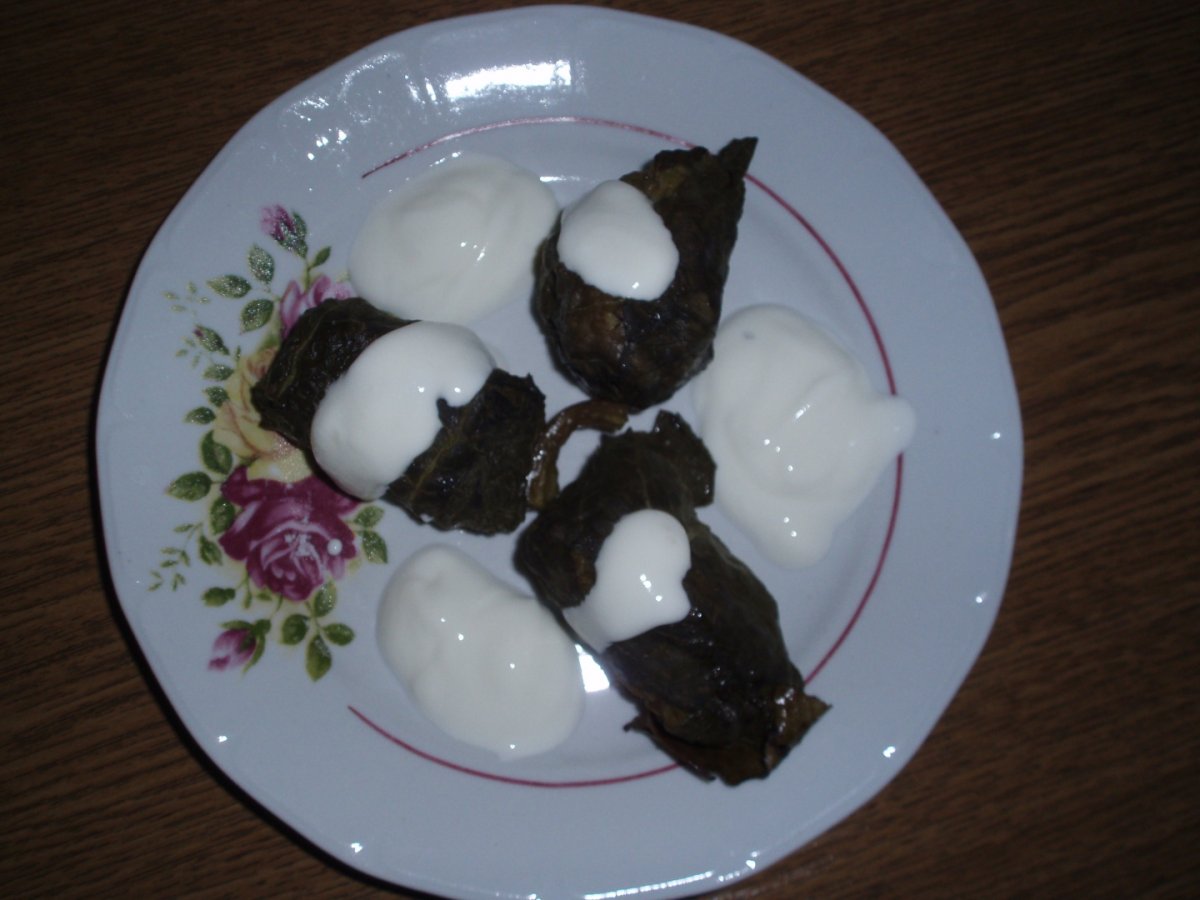 Intr-un vas, punem carnea cu oul, boia, piperul, putina sare. Adaugam ceapa curatata, spalata, tocata marunt, orezul spalat si scurs de apa. Amestecam totul bine, apoi cu lingura luam din compozitia obtinuta, asezam pe cate o frunza, rulam formand sarmalele. Am preparat cam 28 de sarmalute. Pe fundul unei oale punem cateva frunze de vita-de-vie, apoi asezam circular sarmalele, patrunjelul, mararul, adaugam bulionul, completam cu apa sa fie acoperite sarmalutele si fierbem la foc domol cam 2 ore. Se servesc calde cu smantana. Pofta buna!