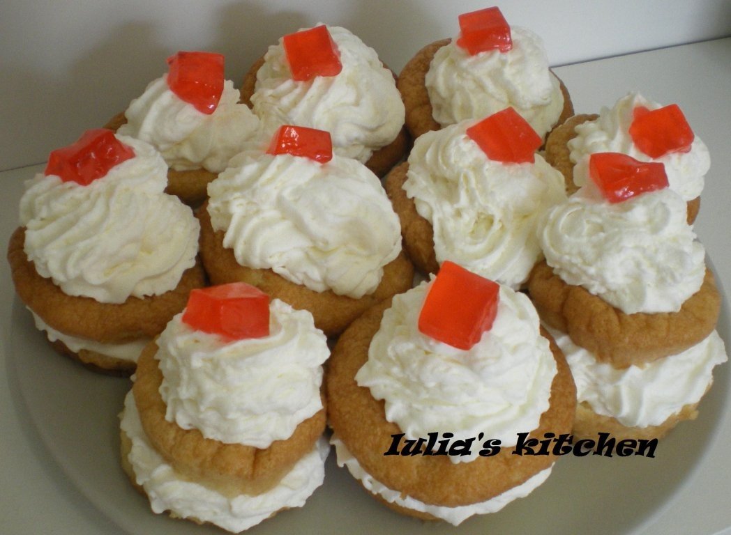 -Cand sunt gata se scot si se introduc in sirop.Se taie in doua si se orneaza cu frisca.