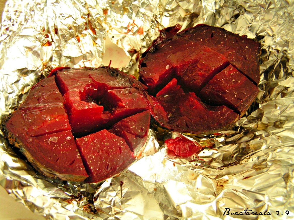 Se invelesc astfel toate sfeclele si se dau la cuptor pana se inmoaie bine. Se poate verifica usor cu o scobitoare. Noi le-am tinut aproape o ora, dar timpul variaza mult, in functie de marimea sfeclelor.