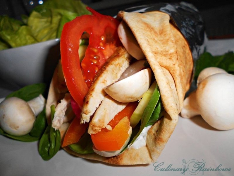 Am așezat lipia pe folie de aluminiu. Am întins crema de brânză, am presărat semințele, apoi am aranjat salata și spanacul deasupra ( eu le-am spălat și le-am dat prin centrifuga pentru verdețuri ). Am continuat cu feliile de castraveți, fâșiile de ardei gras, ciupercile, roșiile iar la final feliile de ridichi.