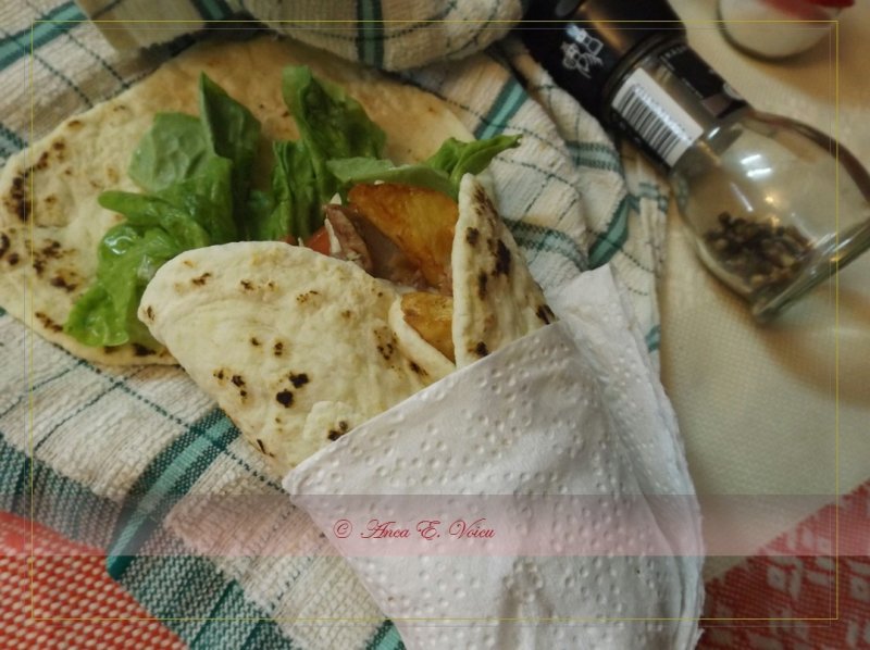 Asezonati rosiile cu putina sare si piper mozaic, pentru a le da mai multa savoare. Puteti pune apoi toate ingredientele pe care doriti sa le folositi ca umplutura pentru shaorma pe farfurie, astfel incat fiecare sa-si umple lipia cu ce-i place.