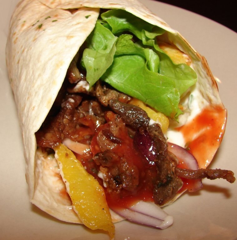 Mie imi place la farfurie dar daca o doriti in lipie ordinea ar fi :se unge lipia cu sosul de maioneza,se adauga cartofii prajiti ,carnea,ceapa,ketchup,sare piper.etc.