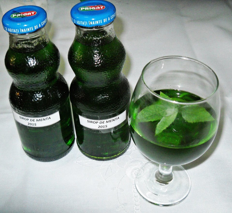 Frunzele de menta le-am spalat bine si le-am lasat la zvantat. Am pus apa si zaharul pe foc intr-o cratita . Dupa ce zaharul s-a topit, am pus menta, am acoperit cratita cu capac si am lasat 15 minute sa fiarba, pana menta si-a schimbat culoarea. Am scos frunzele de menta cu spumiera, am adaugat mierea si am lasat sa fiarba la foc mic in jur de 3 ore. Am facut testul cu picatura, ca la dulceturi. Cand a fost aproape gata, am adaugat colorant si am mai lasat cateva minute sa fiarba. Am strecurat siropul printr-o sita in care am pus un tifon, si l-am pus fierbinte in sticlele sterilizate. Le-am inchis ermetic si le-am lasat pana a doua zi acoperite cu un prosop gros , sa se raceasca.