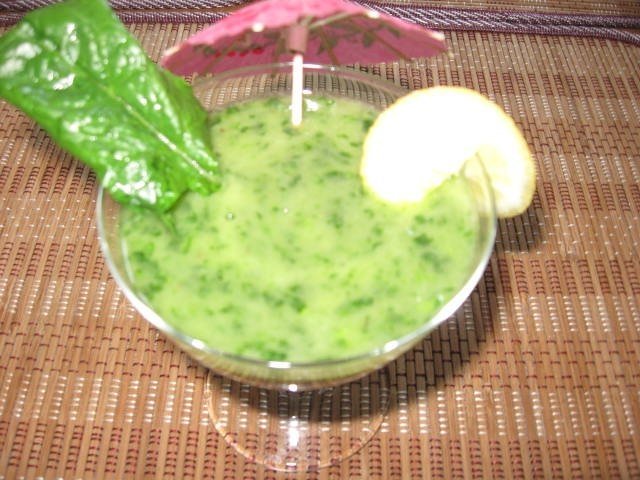Atât fructele cât și frunzele se spală sub jet de apă, se şterg de surplusul de apă.Fructul de avocado l-am copt în tigaia Dry-cooker. Se adaugă pe rând, în blender ,se mixează bine toate ingredientele până se obține o textură cremoasă şi se subţiază cu apă plată în funcţie de consistenţa dorită.