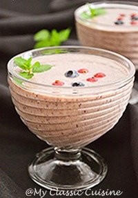 La final se adauga ceaiul verde iar amestecul se omogenizeaza. Se da la rece pentru 30 - 45 de minute. Se serveste cu fulgi de gheata, ornat cu afine/ coacaze si frunzulite proaspete de menta.