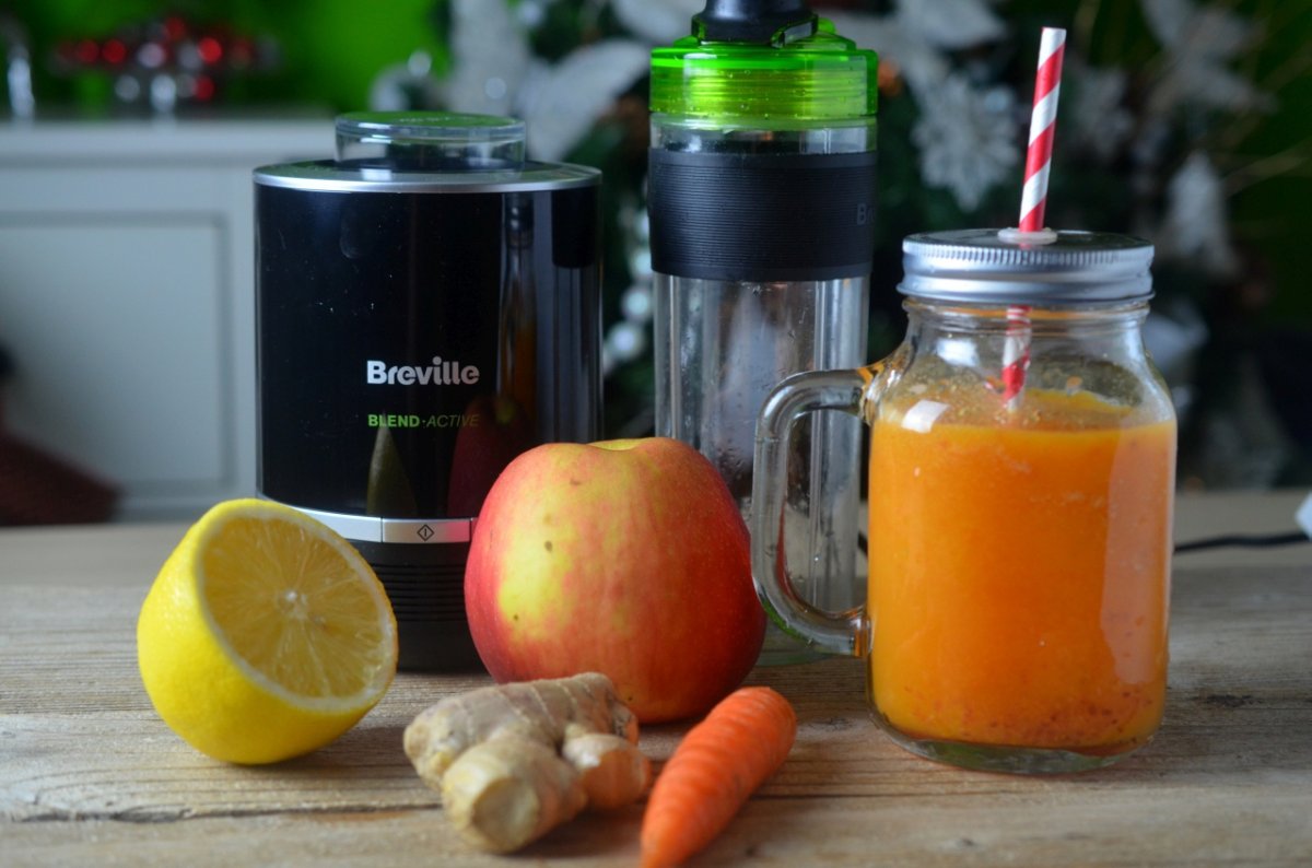 Curatam doar ghimbirul si morcovul (daca e morcov tanar nu il curat, ci il spal foarte bine cu o periuta), marul il spalam bine dar ii lasam coaja, apoi le taiem bucati mari si le punem in blenderul Breville Blend Active Pro alaturi de restul ingredientelor.