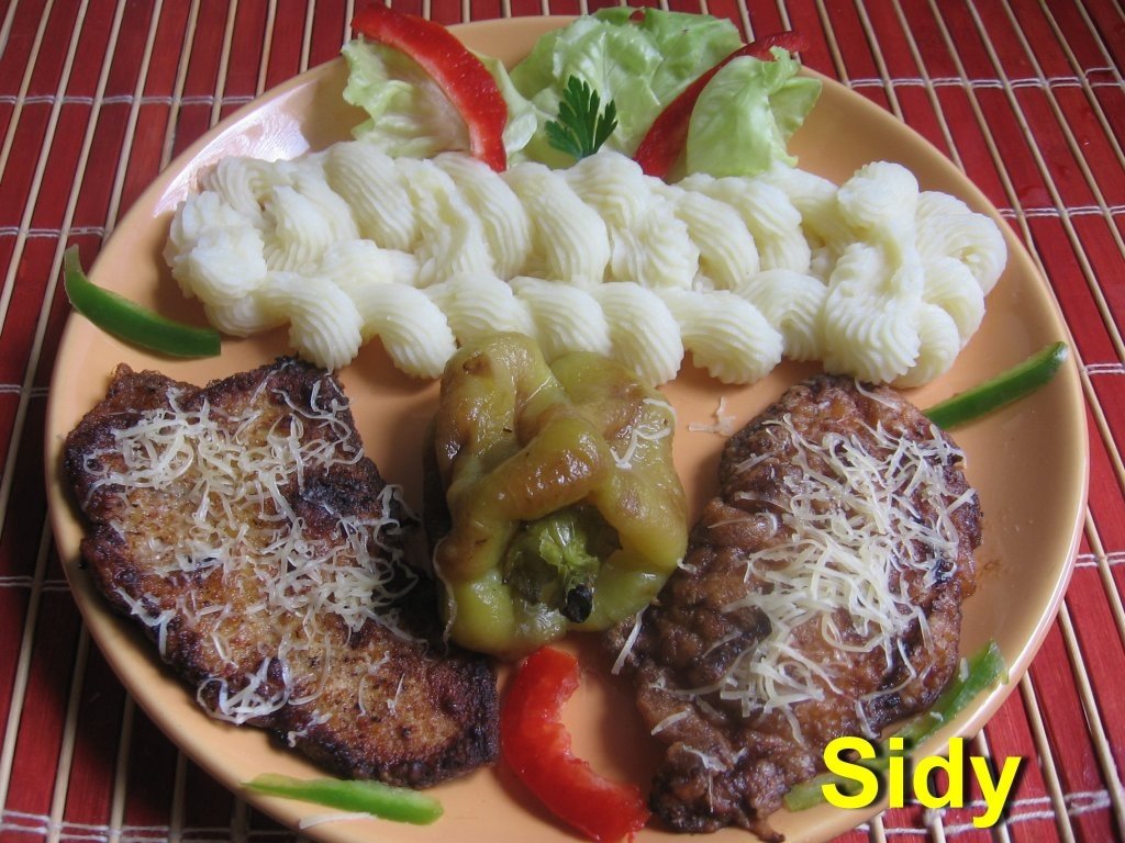 Se serveste cu cartofi piure si cu salata de ardei copti.