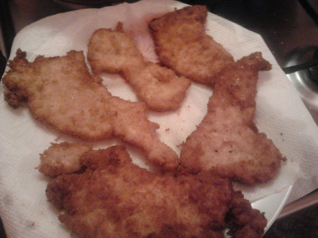 Pieptul de pui se transeaza si se condimenteaza, dupa gust cu condimente pentru carne de pui. Se lasa asa 20 min. Pesmetul se amesteca cu cascavalul ras pe razatoarea mica si praf de usturoi - dupa gust. Feiile de piept de pui se aseaza intre 2 folii alimentare si se bat. Se trec prin ouale batute si apoi prin amestecul de pesmet. Se prajesc in ulei pana se rumenesc.
