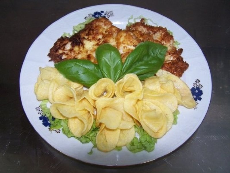 Pieptul de pui se portioneaza in doua bucati, care se bat usor, se adauga piper si sare.