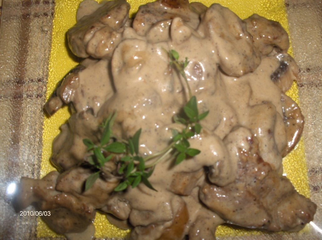 Pune din nou carnea in tigaie, smântâna (eu am pus cu gust de ciuperci) si lasã sã fiarbã putin.