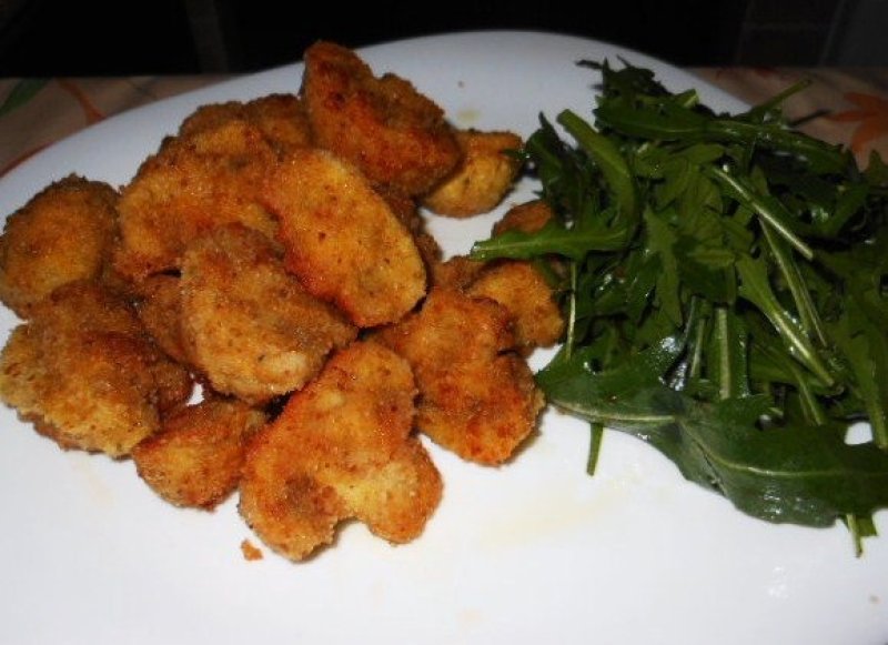 Ciupercile se curata de pielita, se indeparteaza o parte din codita si se spala. Ouale batute se amesteca cu laptele, mirodeniile ,putina sare si piper. Ciupercile se taie in doua pe lungimea coditei. Se pregatesc 3 castronele mai adanci cu faina, ouale condimentate si pesmet. Ajutandu-ne de o furculita infipta in jumatatile de ciuperci, se trec pe rand prin faina , oua si pesmet si se prajesc la foc mediu-mic pana se rumenesc. Se pot servi cu salata rucola cum am facut eu, sau cu un sos tzaziki. Sunt delicioase!