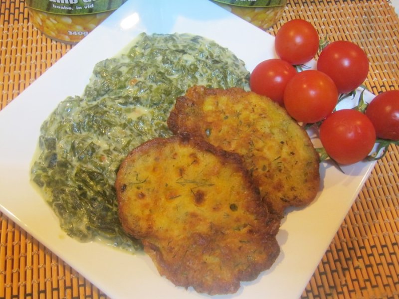 Peste spanac turnam lapte( nu prea mult) si lasam sa dea cateva clocote pina e gata spanacul. Asezonam cu sare si piper.