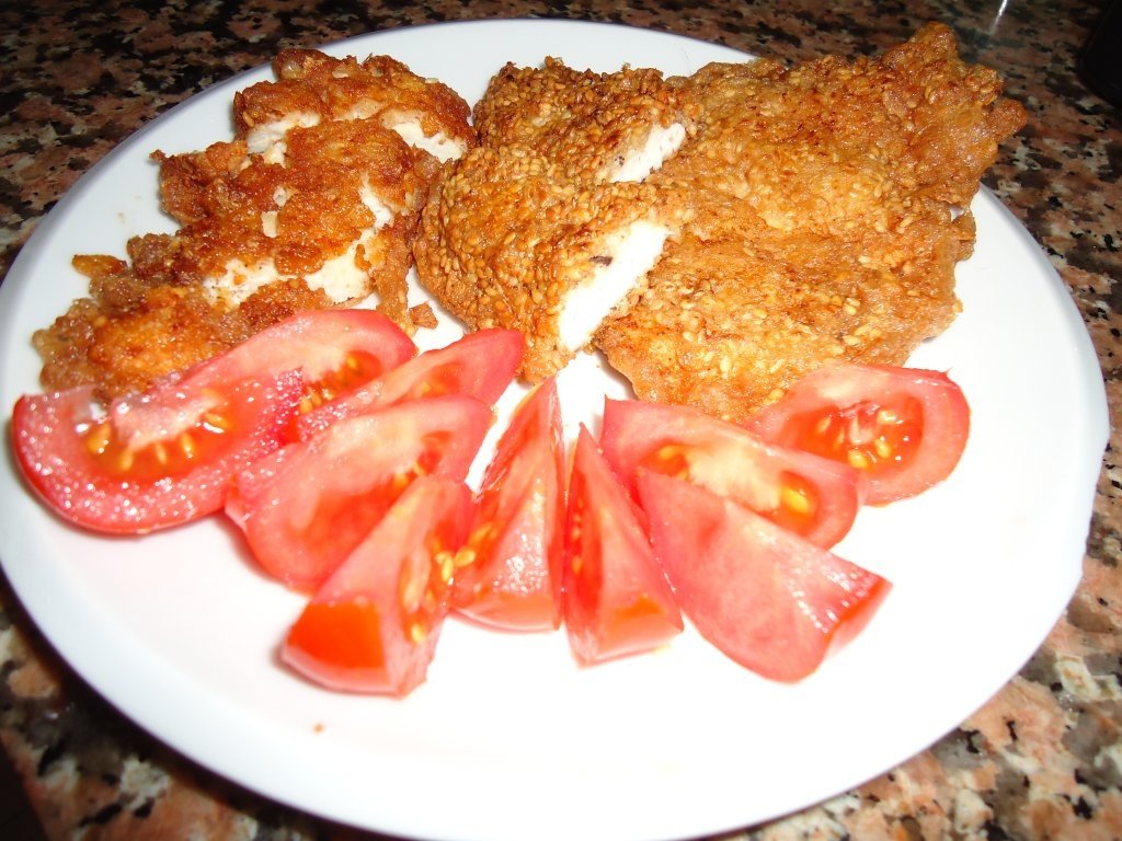 Taiem pieptul de pui filè si condimentam cu sare si piper pe ambele parti.Intr-o farfurie putin adanca se bat ouale spuma cu putina sare.Pe o folie de aluminiu punem intr-o parte susan si in cealalta parte fulgii de porumb maruntiti usor.Intr-o tigaie punem ulei.Cand sa incins bine dam puiul prin susan,ou si il punem la prajit la foc potrivic.Aceasi procedura si cu fulgii de porumb.Se rumenesc bine pe ambele parti si se scot pe hartie absorbanta.Fragede si pufoase!!Se pot servi cu salata verde,rosii,cartofi prajiti...dupa plac. Sper sa va placa. POFTA BUNA!!