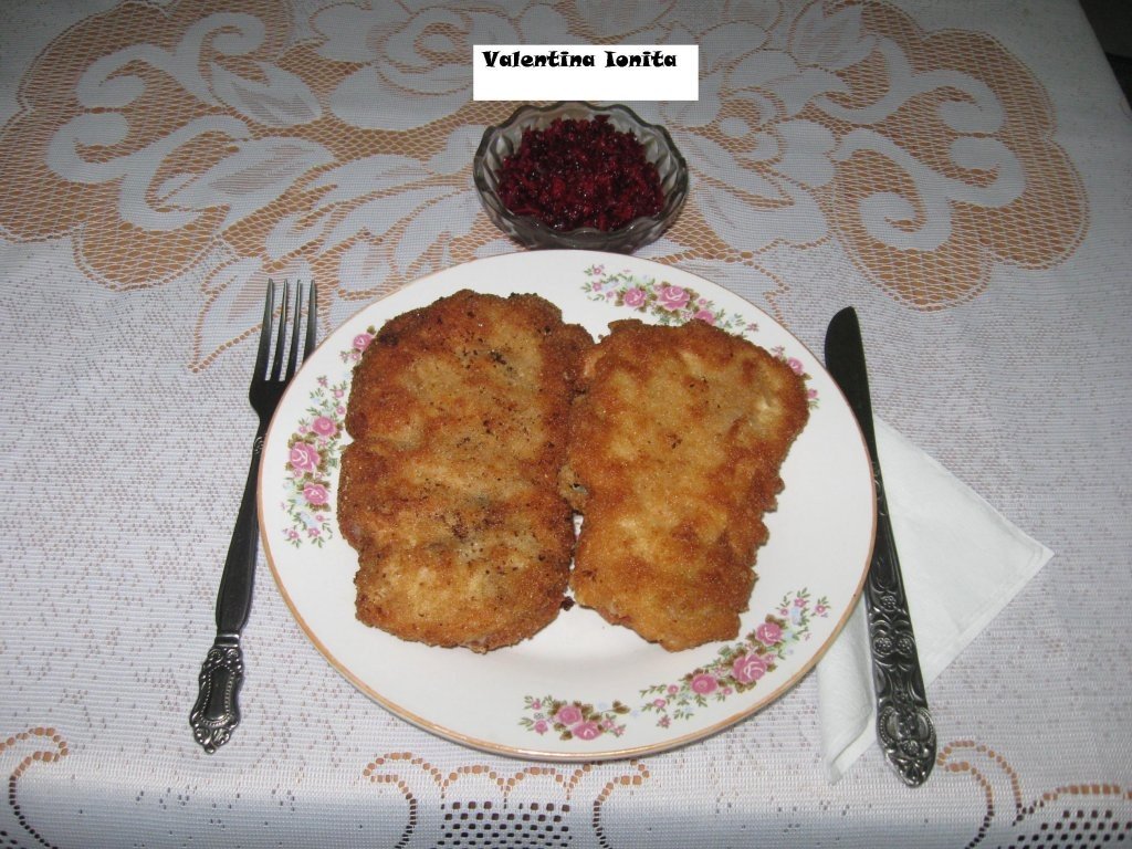 Fiecare bucata de carne, se unge cu branza topita,se aseaza felii de ciuperci, cascaval, iar la sfarsit sunca presata, sunca de Praga, jambon sau ce aveti la indemana in frigider. Se preseaza bine si aveti doua posibilitati pentru prajire;le faceti rulou sau le prajiti ca pe snitele. Le tavaliti foarte bine prin pesmet, le presati bine cu mana pe ambele parti, apoi le dati prin ou si din nou prin pesmet, dupa care le prajiti la foc mediu in ulei fierbinte pe ambele parti.