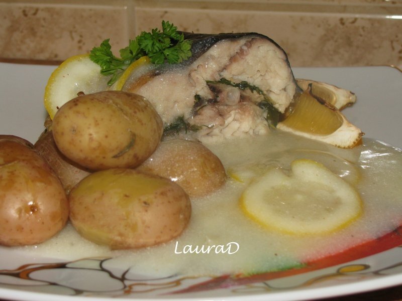 Serveste pestele taiat felii cu cartofi noi fierti si sos de lamaie.