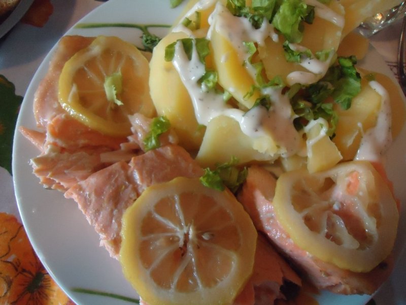 Servim somonul cu garnitura de cartofi natur, si sos presarat cu patrunjel verde.
