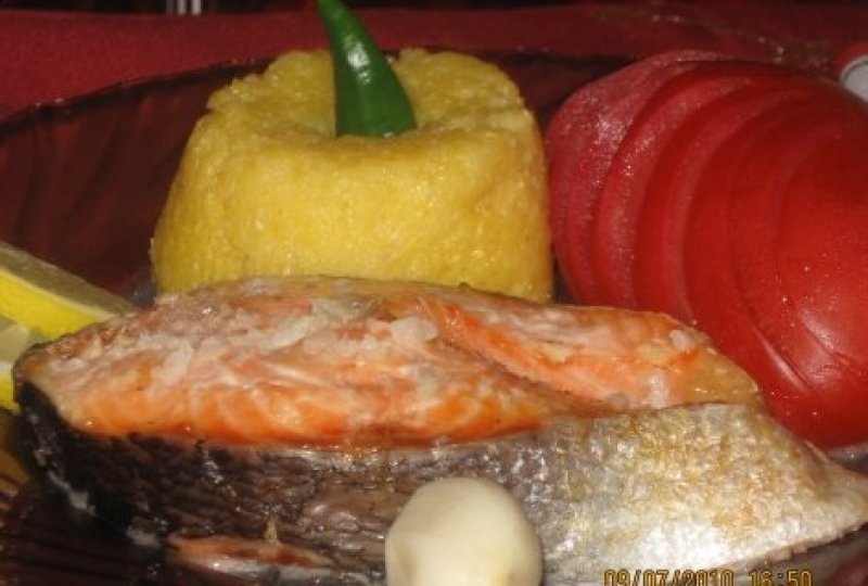 Se spala, se lasa la scurs medalioanele de somon apoi se stropesc cu putin ulei de masline si zeama de lamaie.Se condimenteaza dupa gust cu sare si piper, se aseaza intr-o tava cu gratar in care am pus 1/2 cana cu apa si dam la cuptor intorcandu-le de pe o parte pe alta.Lasam sa se rumeneasca si apoi servim cu mamaliguta si mujdei de usturoi.