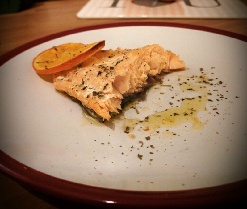 Se pune ulei intr-o tava ce merge la cuptor, se aseaza pestele cu pielea in jos, se toarna untul topit si se condimenteaza (sare, piper, condimente dupa gust), se aseaza feliile subtiri de portocala(lamaie) si crengutele de rozmarin.