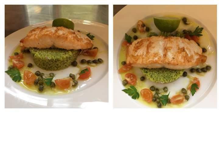 Pentru design-ul farfuriei taiem 2 rosii cherry felii, amestecam cu ulei de masline si putina zeama de lamaie si cu ajutorul unei linguri punem pe marginea farfuriei. Dupa cele 10 minute luam somonul si il punem peste cous-cous cu atentie.