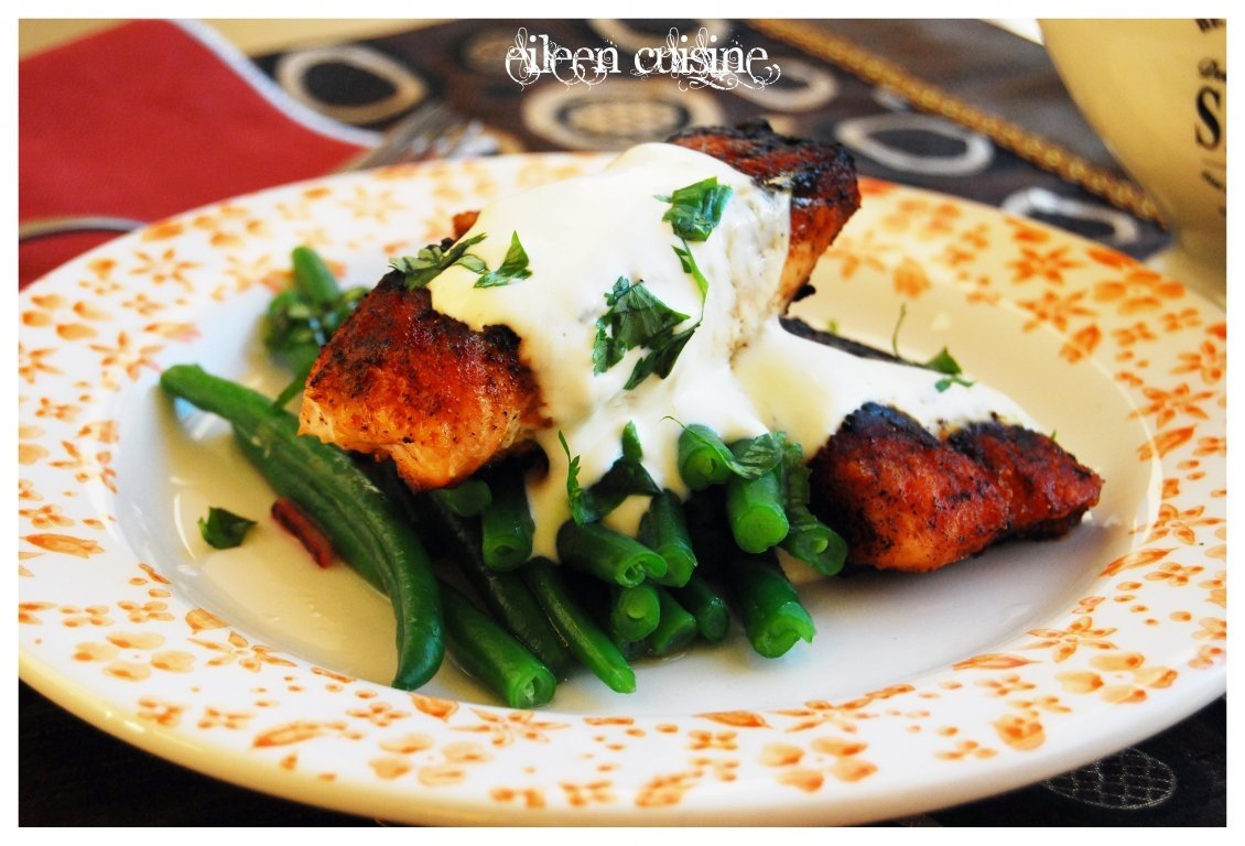 Asezati fasolea pe o farfurie, deasupra puneti somon, sos de smantana si presarati coriandru tocat marunt.