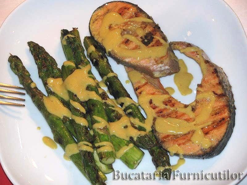 Aranjam pe farfurie tulpini de sparanghel, bucati de somon si stropim cu sosul de mustar ramas.