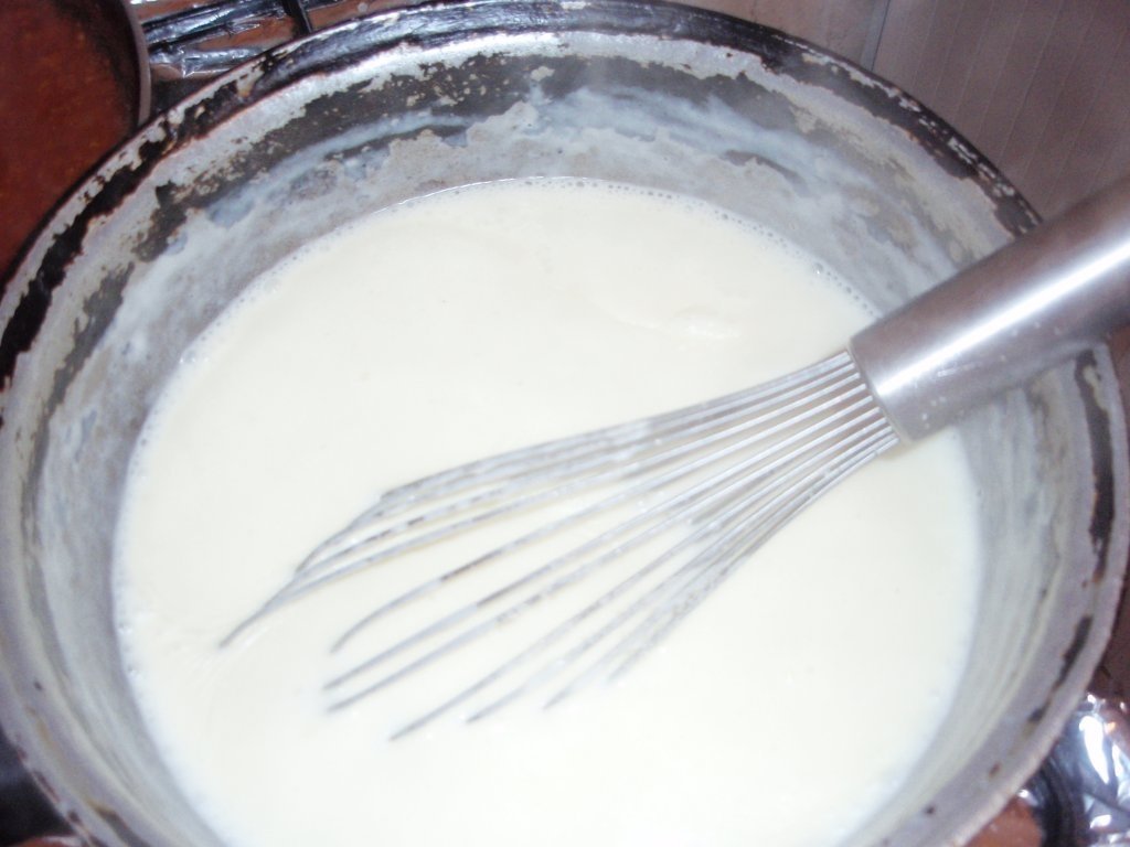 Se topeste untul, se adauga faina si se amesteca energic apoi se adauga laptele putin cate putin amestecand continuu. Se condimenteaza si se fierbe la foc potrivit 10 minute sau pana se ingroasa. La sfarsit se adauga parmezanul.