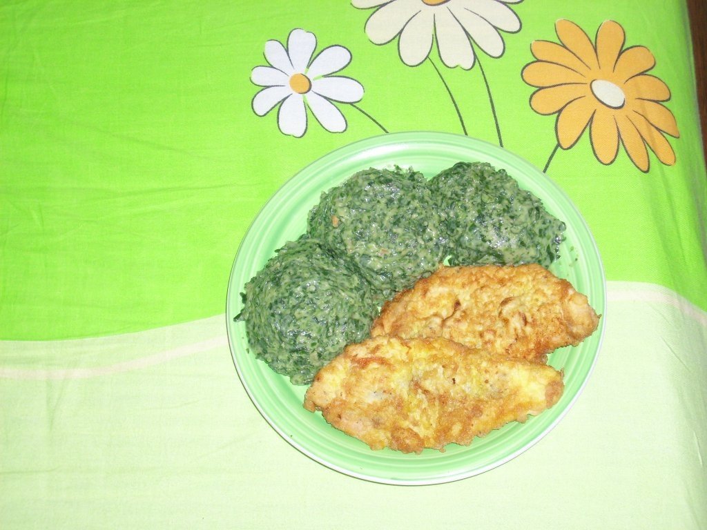 Portionam pieptul de pui si batem fiecare bucatica de carne in parte, apoi condimentam, trecem snitelele prin faina si apoi prin ou si prajim in ulei.
