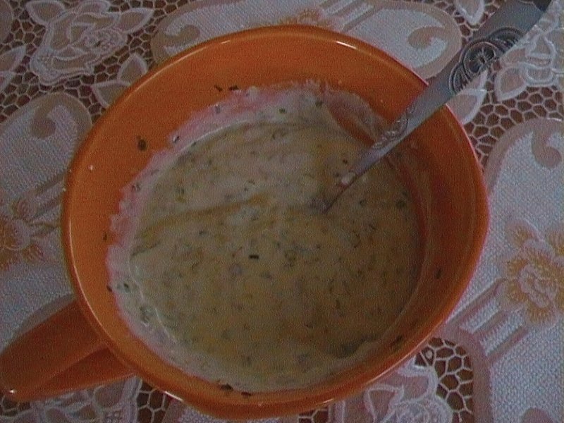 Usturoiul verde se taie marunt, se piseaza cu sare, se freaca cu cateva linguri ulei de masline si se adauga un pahar de iaurt.