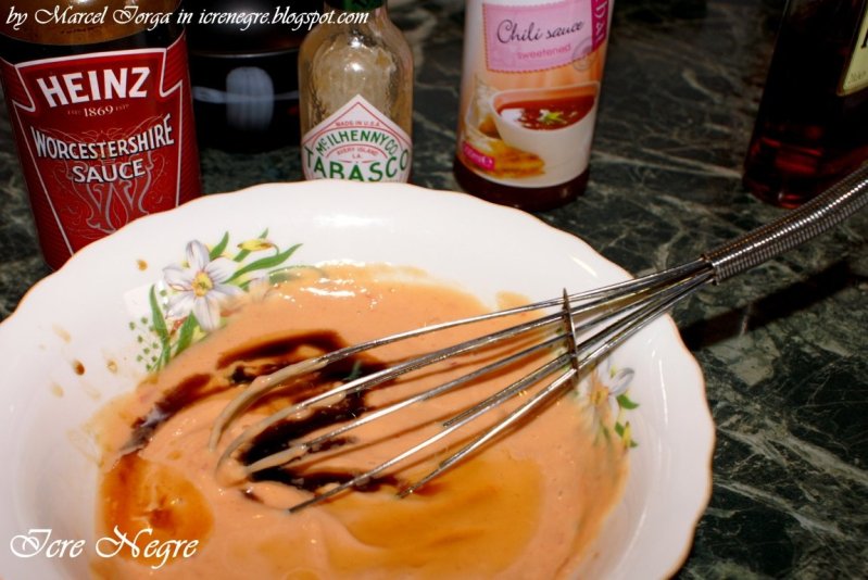 Întrun bol, amestecaţi maioneza, ketchupul, sosul de chilli, sosul Worcestershire, sosul Tabasco, cogniacul şi ceapa rasă.