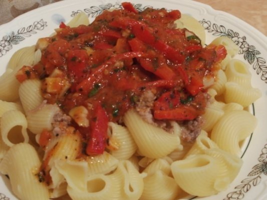 Oparim cu apa clocotita rosiile si le decojim ,le taiem cubulete.Pisam cu latul cutitului usturoiul apoi il taiem bucatele il prajim 2~3 minute la foc mic .Adaugam rosiile le prajim pina se schimba un pic culoarea si adaugam capia taiata pai cu lungimea de 4 cm. Adaugam sarea ,zaharul, busuiocul, cimbru, boia, cili si prajim inca 2~3 minute .La sfirsit adaugam patrunjel si leustean proaspat si oprim focul.Lasam 2 minute sa se mai condimenteze si cu zarzavatul proaspat ,si pofta mare .Eu am adaugat si putina carne de porc inabusita din conserva si am calit-o putin.