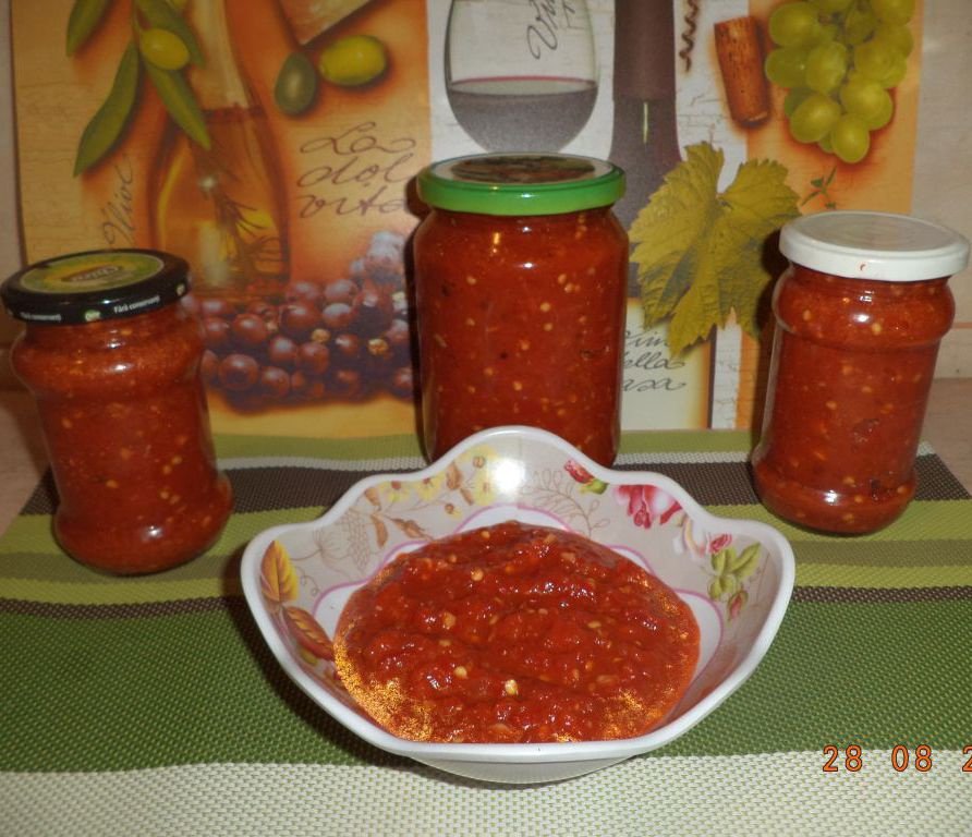 Cand incepe sa fiarba, adaugam si ardeii, potrivim gustul de sare si lasam sa dea cateva clocote. Punem sosul in borcane sterilizate, acoperim cu putin ulei si fierbem borcanele la bain-marie cca. 20 de minute.