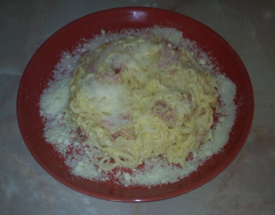 Pastele se fierb conform instructiunilor de pe ambalaj. Baconul, sunca si usturoiul se taie fasii si se calesc in unt. Intr-un castron se amesteca smantana,albusurile si parmezanul apoi se adauga peste sunca si bacon si se lasa la fiert la foc mic amestecand continuu. Se adauga sare,piper si pastele scurse si se mai lasa la fiert pana se omogenizeaza. Se servesc calde cu parmezan dupa gust.