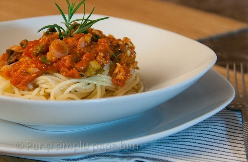 Separat, am călit în ulei de măsline ceapa şi usturoiul verde, am adăugat conserva de roşii şi am lăsat sosul să dea câteva clocote. După ce l-am luat de pe foc, am adăugat brânza, ierburile tocate, sare şi piper. Gata papa în doi timpi şi trei mişcări!