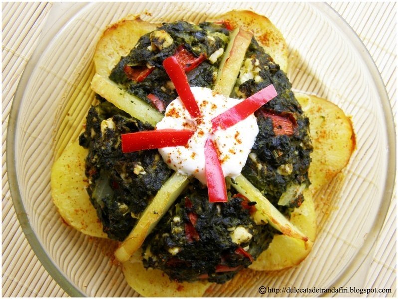 Apoi adaugi jumatate de pahar de apa si lasi cam 15 minute la fiert, condimentezi cu piper si sare. Pui compozitia intr-o strecuratoare sa se scurga zeama lasata de spanac, amesteci cu branza feta maruntita.