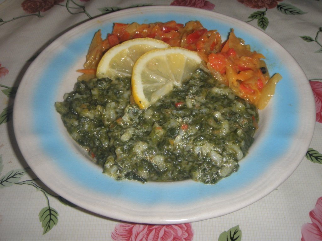 Spanacul proaspăt se spala foarte bine se rupe bucăți (dacă e congelat scăpam de toate grijile astea trebuie doar pus în oala). Orezul se spala în mai multe ape. Ceapa se toaca mărunt, se călește în ulei de măsline, se adaugă morcovul dat prin răzătoarea mica și orezul. Totul se prăjește ușor. Se adaugă supa, sarea, piperul și spanacul. Se fierb 15-20 de minute pana scade apa. Se ia de pe foc se stropește cu zeama de lămâie. Se servește alături de o salata(eu am folosit salata de toamna) ,iar pentru cei care nu țin post merge foarte bine cu un ou prăjit și puțin iaurt alături. Sa aveți pofta!