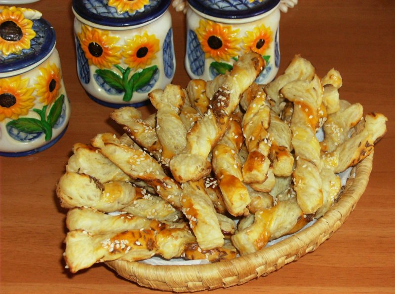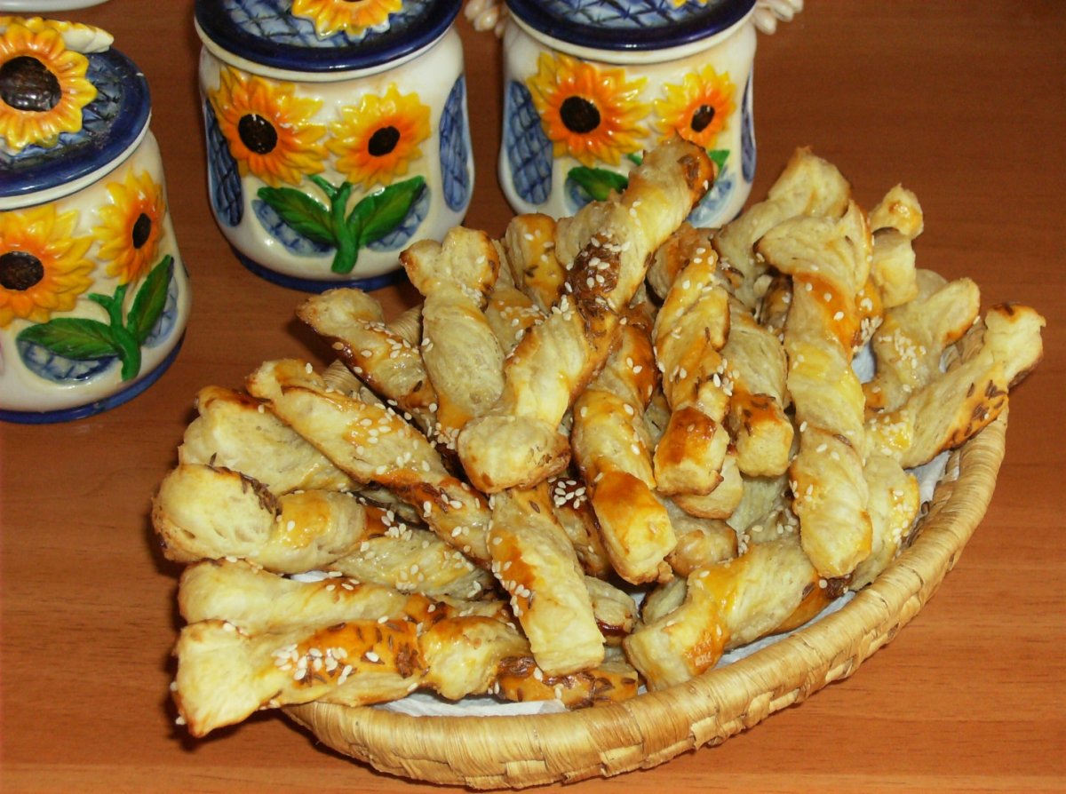 Tăiem batoane subțiri de 1-1,5 cm cu 10-12 cm, apoi le sucim una câte una în ambele capete. Așezăm spiralele pe o tavă tapetată cu hârtie pentru copt. Ungem suprafața spiralelor cu gălbenuș de ou și presărăm deasupra semințele de susan. Putem lăsa aluatul în forma de dreptunghiuri fără a-l spirala.