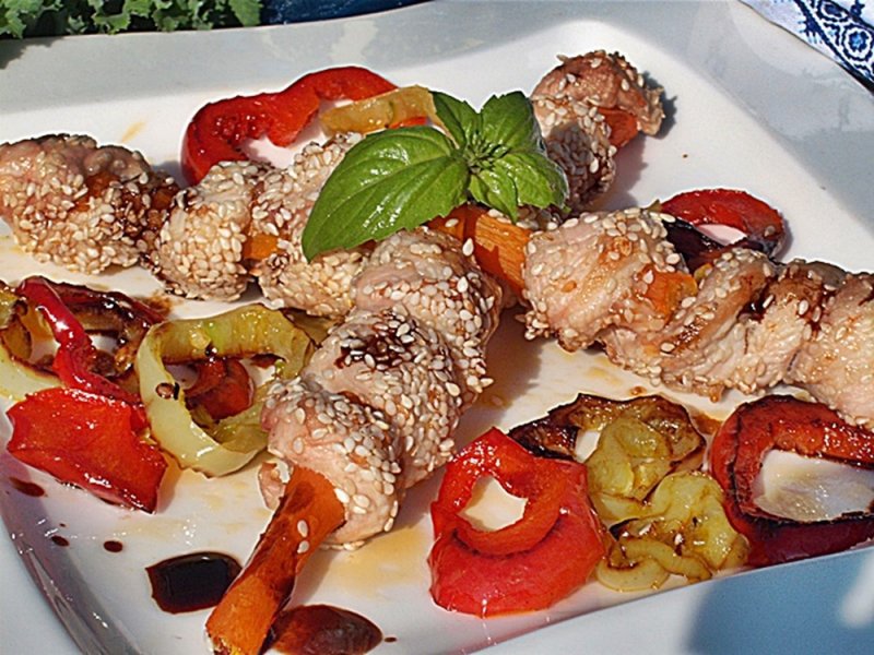 Fasiile de piept de pui se infasoara in spirala pe morcovii fierti si raciti,apoi se prind cu cate o jumatate de scobitoare de bambus,la fiecare cap al fasiei respective,se dau prin semintele de susan,apoi se prajesc pe gratar sau se prajesc in ulei