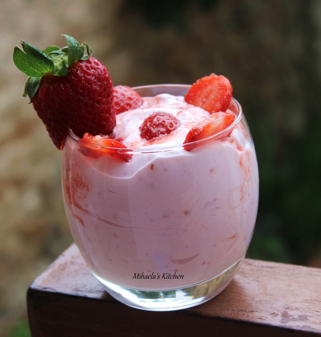 Am batut albusurile cu mixerul si treptat am pus zaharul in acest timp mixand pana cand compozitia devine tare. Dupa ce am spalat capsunile si le-am curatat, le-am pus in blender pana ce au devenit o crema pe care am turnat-o peste albusurile batute. Se amesteca cu lingura de lemn de jos in sus pana se incorporeaza bine. Compozitia o adaugati in boluri ori castronele, le ornati dupa bunul plac si dati la rece pentru cateva momente.
