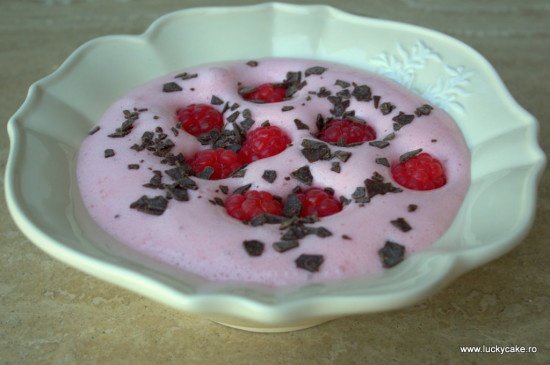 Albusurile le mixam ca sarea pana devin spuma 3-4 minute.Adaugam zaharul treptat, cate o lingura si mixam cate un minut dupa fiecare. Dupa 4 linguri de zahar adaugam si zeama de lamaie, gustam si continuam cu zaharul, daca e destul de dulce nu mai adaugam zahar, daca va place mai dulce mai puteti adauga 1 lingura. La final spuma trebuie sa fie ferma si lucioasa. Jumatate din capsuni le pasam cu blenderul sau le zdrobim bine cu furculita, iar pe cele din celalata jumatate le taiem bucati mai mici. Adaugam toate capsunele peste albusuri si mixam pana se omogenizeaza. Dam la rece o ora, apoi o servim cu zmeura si fulgi de ciocolata. Enjoy!