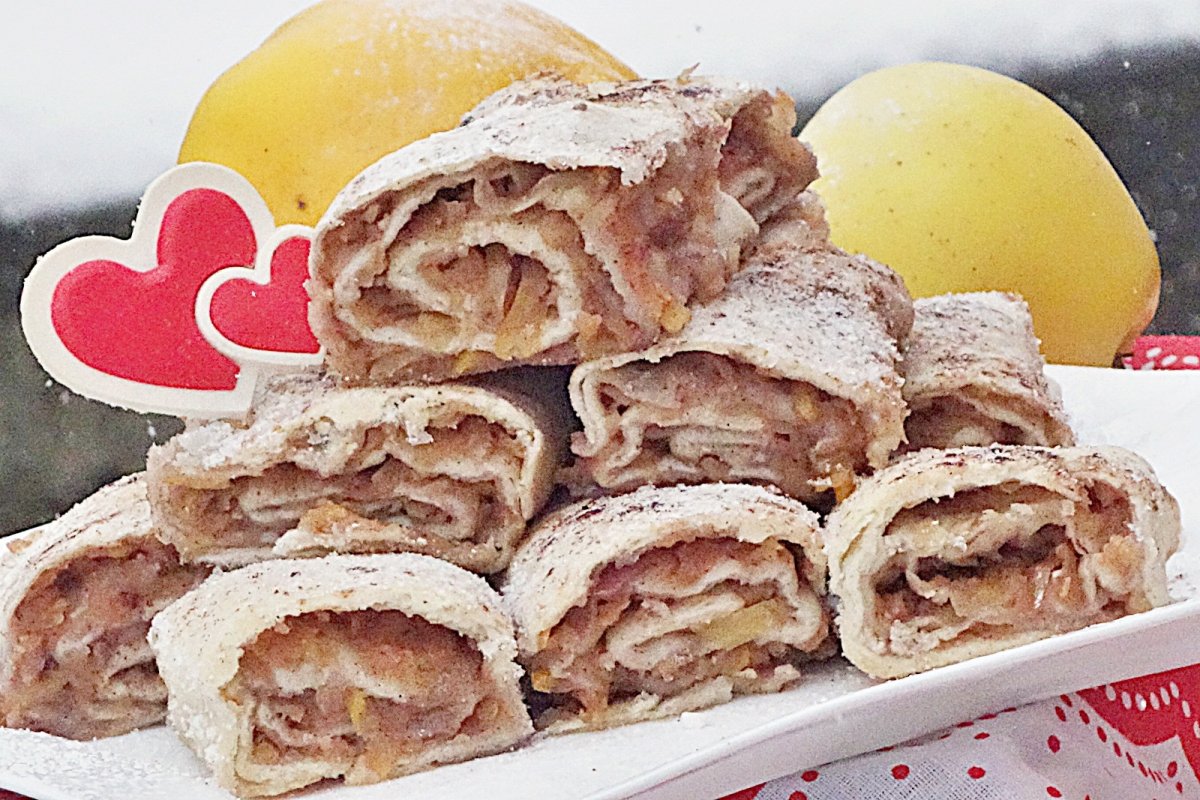Din fiecare biluta se intinde cu sucitorul foi subtiri peste care se adauga compozitia de mere si gutui, pe toata suprafata foii, in strat subtire, apoi se presara deasupra miez de nca maruntit (prajit inainte si racit), apoi se ruleaza cu grija si se asaza in tava una langa alta. Se stropesc bine cu ulei deasupra, apoi se presara si un pic de scortisoara si zahar vanilat si se da la cuptor cca 25 minute, la foc iute la inceput si moderat apoi, pana se rumenesc usor deasupra. Se scot din cuptor si se presara zahar pudra vanilat, apoi se taie in bucati mici. Se servesc dupa ce se racesc!