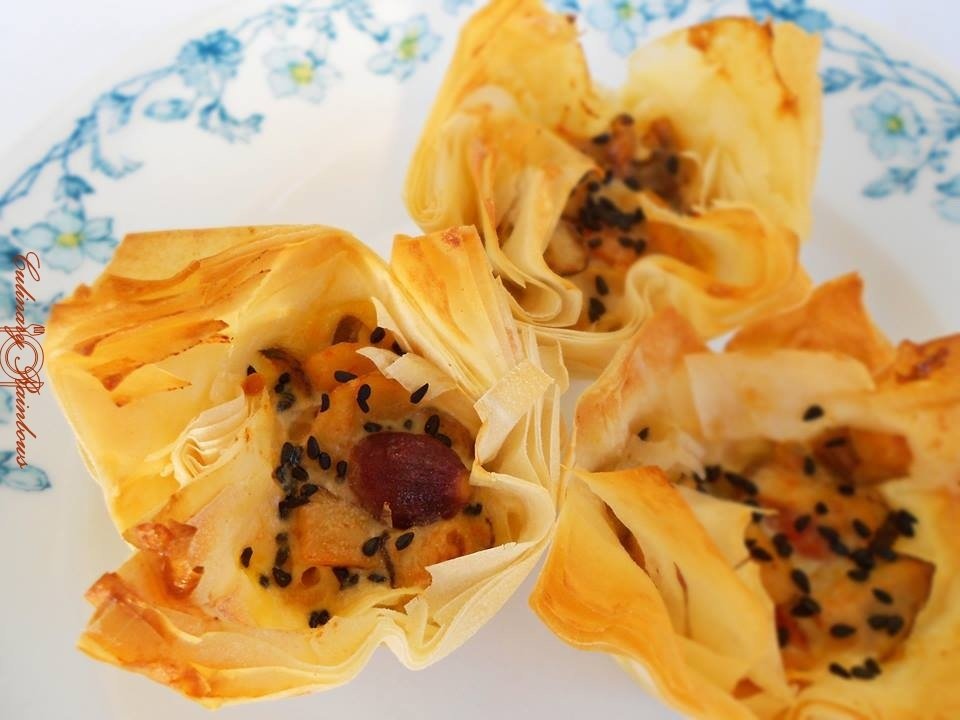 Din foile de plăcintă pe care le-am tăiat în 9 pătrate egale am folosit câte 4-5 pentru fiecare coșuleț. Le-am așezat în tavă și le-am umplut cu hribile sotate.
