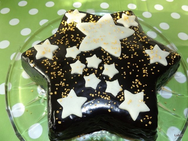 Blatul racit,se pune pe un platou,se intinde glazura bine pe toata suprafata,se pun stelutele,se presara cu zahar aurit apoi se lasa la frigider pana in momentul servirii.
