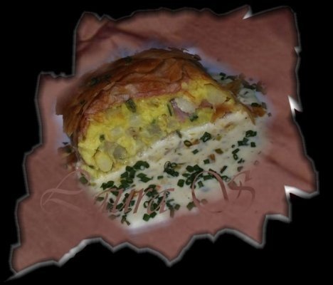 Peste foi se aseaza pe 2/3 din suprafata feliile de sunca.Peste sunca se intinde masa de cartofi,iar deasupra se aseaza Sparanghelul fiert caruia i s-au taiat virfurile si s-au pus deoparte.