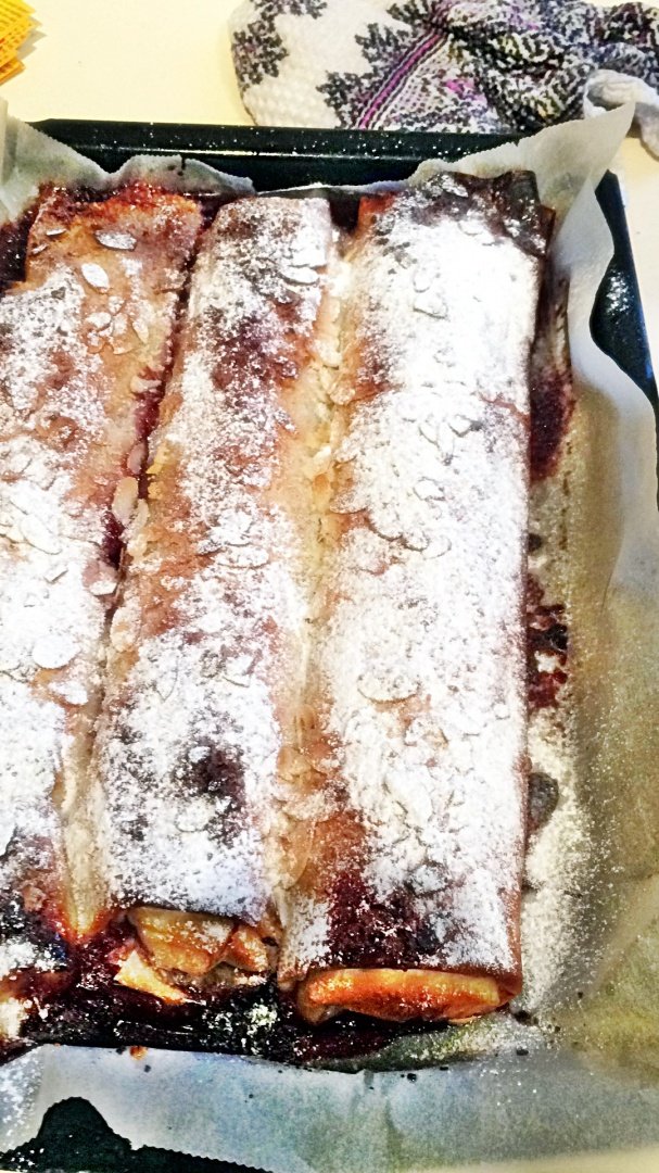 Foile dezghețate se ung câte 4 foi de plăcintă cu ulei de cocos, se suprapun, apoi se adaugă amestecul de vișine cu căpșuni și fulgi de migdale, se rulează ușor, așezându-se apoi într-o tavă termorezistentă tapetată cu foaie de pergament. Se procedează la fel cu celelalte foi. Uleiul de cocos rămas se pune peste strudele, apoi se presară fulgi de migdale și zahăr brun.