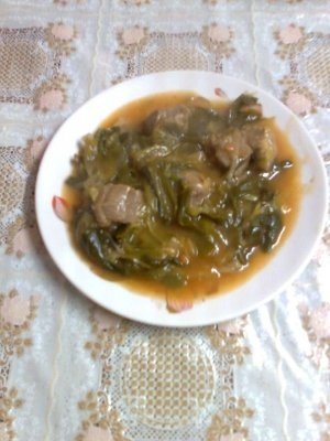 Ceapa si usturoiul se curata,se spala si se taie bastonase scurte de cam 2 cm,se fierb 10 minute cu carnea la foc mic,se toarna bulionul sau pasta de tomate diluata cu apa,se condimeneteaza dupa gust.Eu am facut si dintr-o cantitate mai mica de carne,doar cateva bucatele,ceapa verde am folosit doar 15 fire deoarece era mare,iar faina am adaugat-o la sfarsit dizolvata in putina apa rece.