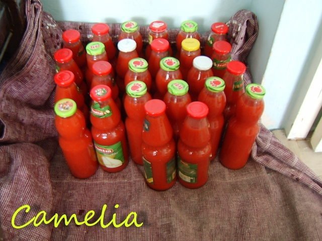 Am avut rosii din acelea lunguiete carora eu le spun prunisoare sau am mai auzit ghinde. Le-am spalat bine, le-am taiat in doua, le-am dat prin masina de separat rosii pana am umplut ceaunul de 30 de litri. L-am pus pe foc si l-am tinut pana a scazut trei degete. La inceput trebuie sa stai langa el ca da in foc si trebuie amestecat continuu, apoi treci pe la el sa bagi in foc. In timpul acesta pregatesti sticlele. Le clatesti si la bagi la cuptor pana raman uscate in interior. Eu am facut in sticle de 750ml cu gura larga si cu filet si mi-au intrat 26 de sticle.Cand sucul a fiert si sticlele sunt gata, dam ceaunul jos de pe foc si incepem sa punem in sticle. Punem sticlele pe o tava de inox si cu polonocul turnam cate putin in fiecare sticla sa nu se sparga. Cand le-am terminat le punem capacele, le stergem cu o carpa udata cu apa calda. Asa procedam si cu restul de sticle. Le luam apoi in casa si le invelim bine, bine cu multe straturi de haine si paturi timp de trei zile. Sucul de rosii tine 2 ani.